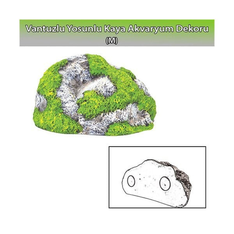 Tabanında bulunan vantuzlar sayesinde akvaryum camında istenilen yere kolaylıkla monte edilebilen yosunlu kaya dekoru.