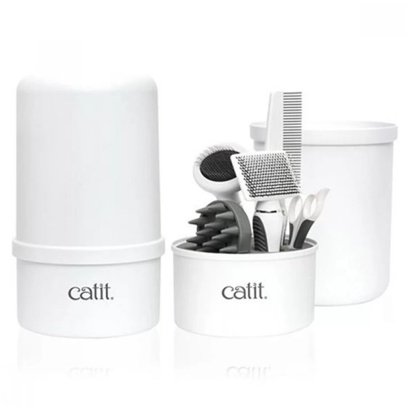 Catit Kedi Tüy Bakım Seti, kedinizin günlük bakımı için her aleti içerir. Plastik slicker fırça, metal slicker fırça, lastik tarama fırçası, kaliteli bakım tarağı ve kavisli tırnak makası ile kedinizin bakımı için gerekli olan tüm ürünler catit kalitesiyle bir sette yer almaktadır. Set içerisindeki ürünleri kullanılmadığı zaman kendi orijinal kutusunda şık ve güvenli bir şekilde muhafaza edebilirsiniz. Fırça ve taraklar uçlarının bozulmaması için kutusunda dik olarak muhafaza edilmesi önerilir.