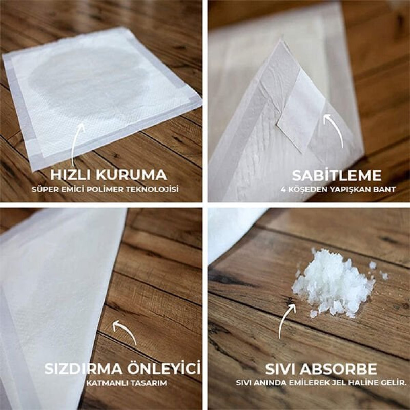 Tuvalet pedinin dört köşesinde yapışkan bantlar bulunur. Bu bantlar pedi yere sabitleyerek kaymasını önler. Bu sayede dostunuzun tuvalet eğitimini kolaylaştırır.